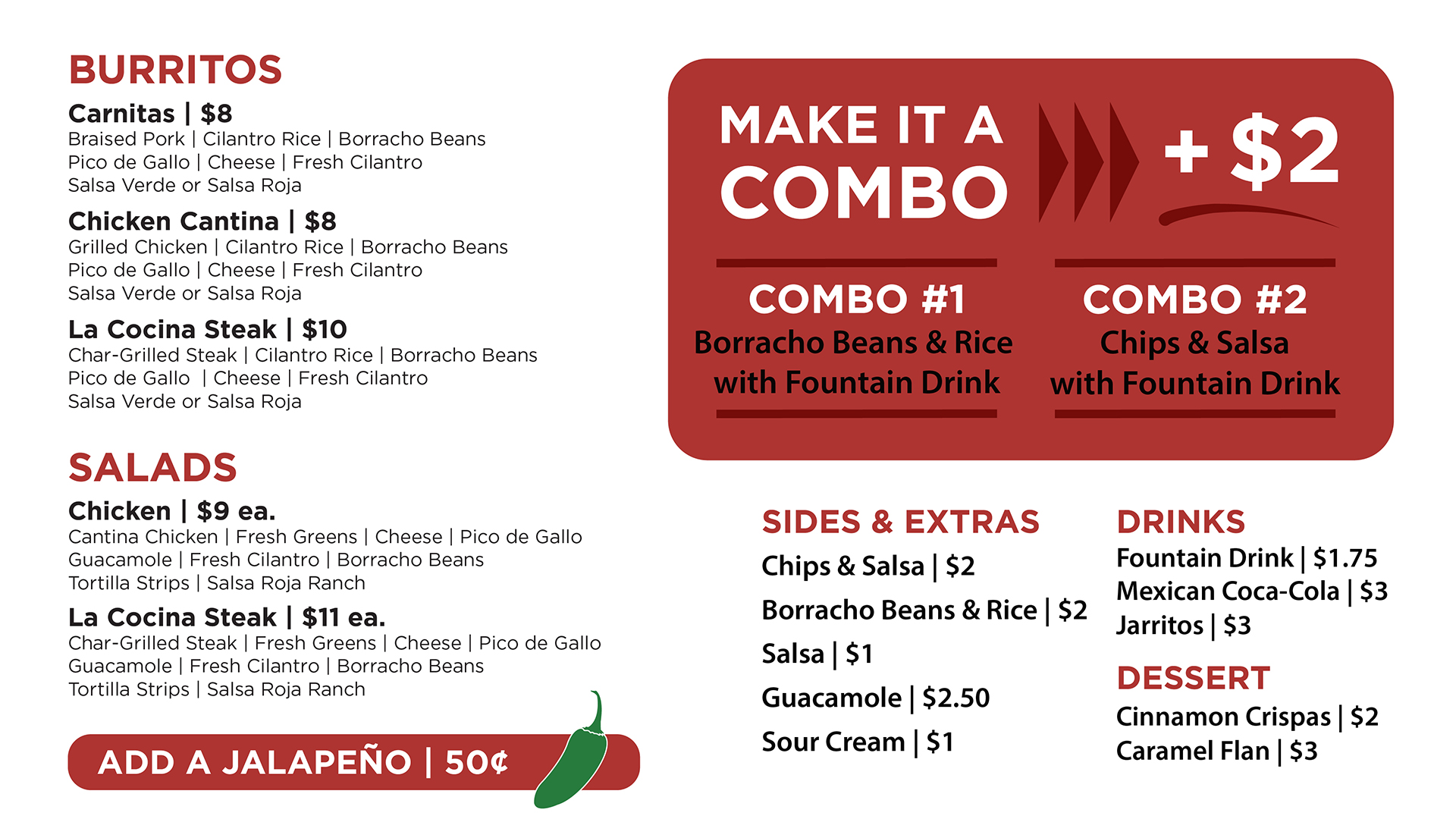 Head to La Cocina located inside Surfside on Camp Kinser to find the same street tacos and burritos you know and love from the food truck—plus a few extra-delicious additions. La Cocina’s brick-and-mortar location has an expanded menu that includes quesadillas, loaded nachos, salads as well as cinnamon crispas and caramel flan for dessert.