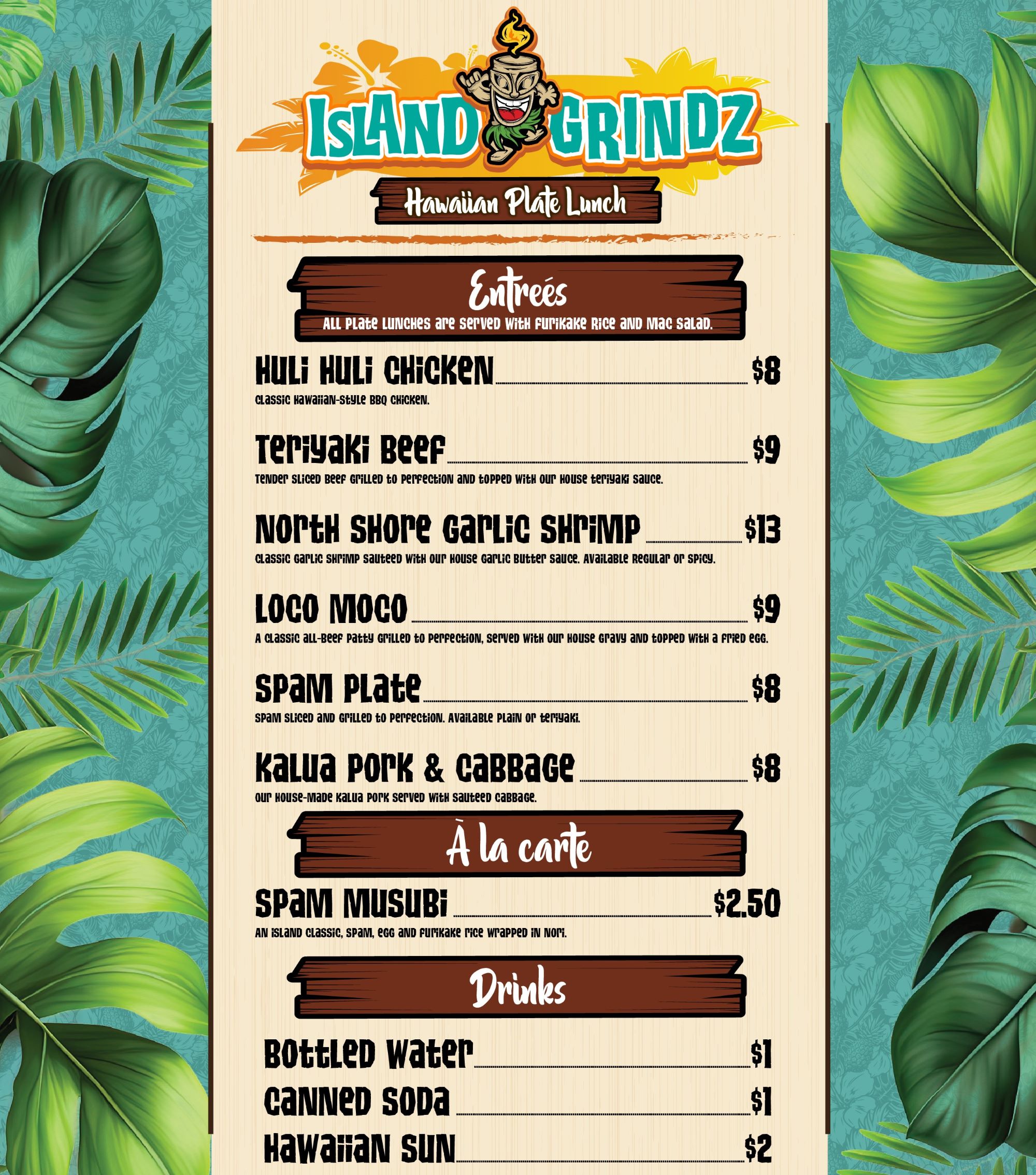 Island Grindz features freshly prepared authentic Hawaiian plate lunches including Huli Huli Chicken, Teriyaki Beef, North Shore Garlic Shrimp, Loco Moco, Kalua Pork & Cabbage and more! All entrées come served with furikake rice and mac salad—as all Hawaiian plate lunches should! Beverages, including everyone’s favorite juices from Hawaiian Sun, will also be available to wash your meal down.
