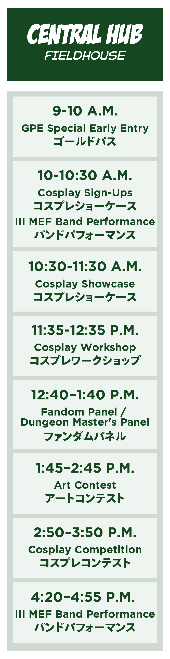 The event takes place every year in December throughout three venues on Camp Foster. The Fieldhouse hosts the Central Hub, the Community Center hosts the Gaming Hub and Globe & Anchor (inside Ocean Breeze) hosts the Q&A. The Community Center parking lot hosts MCCS food trucks & booths as well as the Kiddie Kingdom, which features various amusement rides.