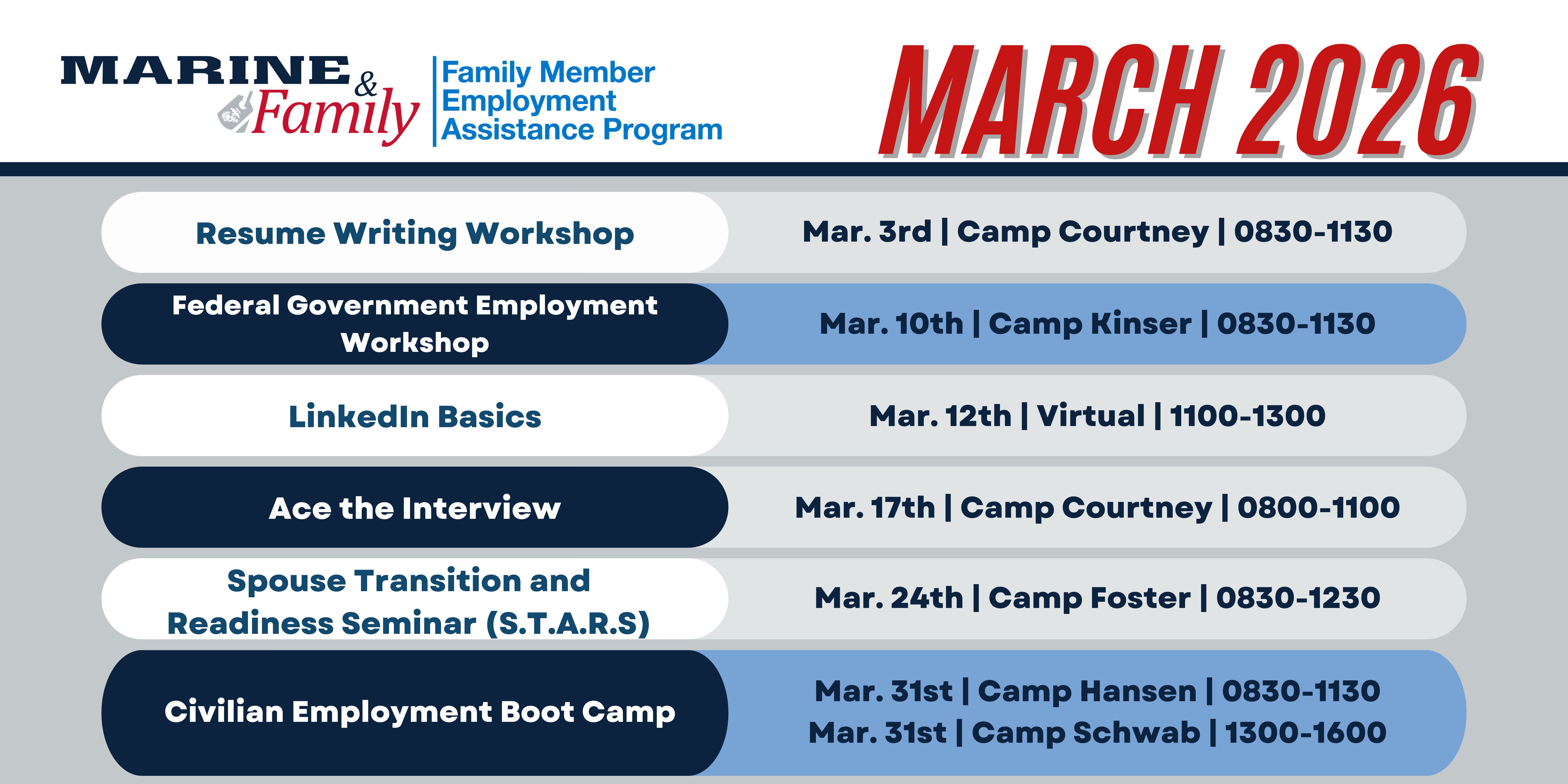 This workshop is designed to provide support and resources for military spouses as they navigate various aspects of transition, particularly during periods of relocation or when their service member is transitioning out of the military. Contact the FMEAP office for workshop availability in your area.