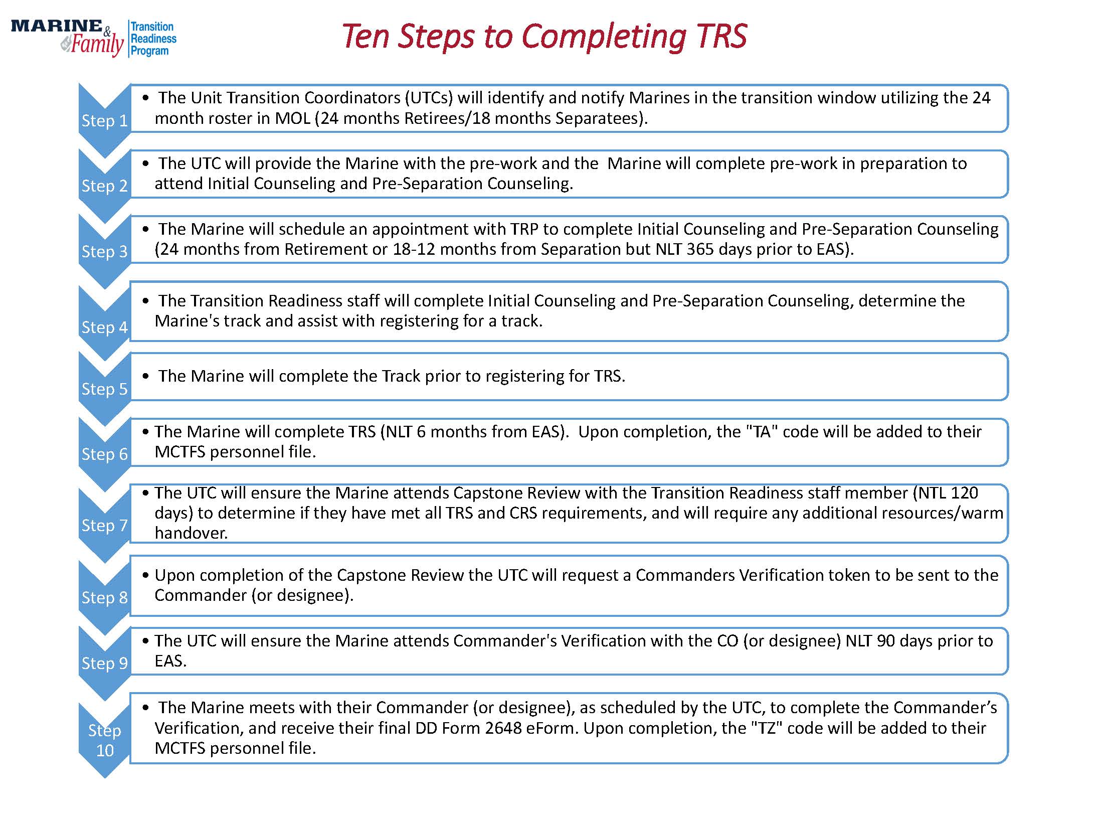 The Unit Transition Coordinator (UTC) coordinates with the installation transition office to ensure the Service Members within their units meet all requirements for the Transition Readiness Program (TRP). As the UTC, you will ease the process of transition to civilian life for all separating, retiring, deactivating, and demobilizing Service Members regardless of their rank. In order to become a UTC, you must be appointed in writing by the CO. Please use the UTC letter template listed under resources. Once the letter has been completed, please email a copy to MCBB_TRP@usmc.mil to request UTC training.